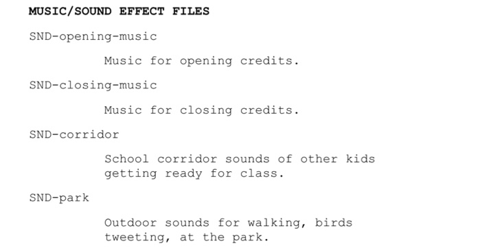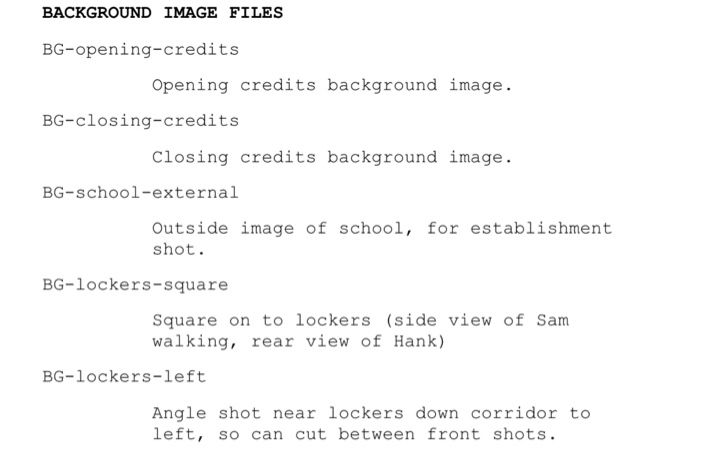 The second major section in my screenplay is a technical section listing the asset files I would need to produce the screenplay. This helps me with project planning and understanding what I am getting myself into. Anyone can read and understand the previous overview, this section gets into the mechanics.