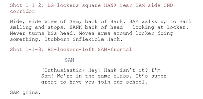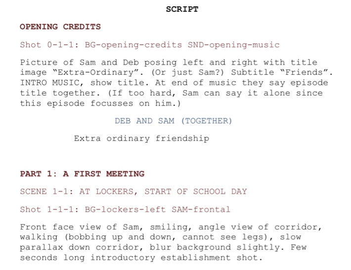 There are other conventions, like putting camera shots or special effects in upper case so they are easier to spot when scanning the script, or starting paragraphs specific to a character with that character name. There are also a few instructions such as transition effects coming into or leaving a scene or shot. I find myself just using notes at the start of a shot is sufficient due to the level of detail I want. I keep quite detailed notes up front to avoid effort during the slightly brain numbing and tedious technical stages of assembling and rendering all the content. Crunching through generating all the video sequences is more mechanical than creative, so I liked doing all the creative thought process up front (and hence write it down).