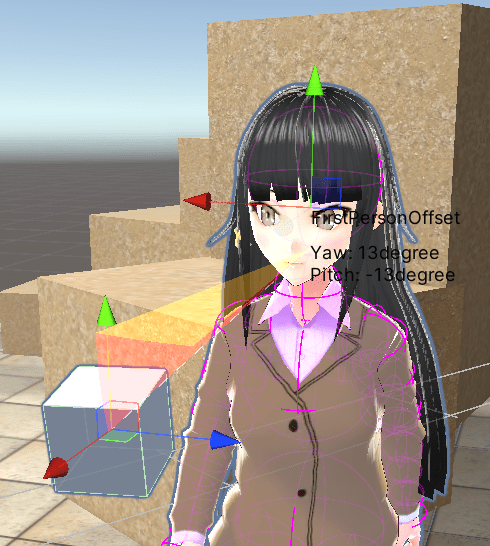 For example, in the following I put a cube in front of the face, dragged the cube GameObject into the “Target” field of the VRM Look At Head script on the character, then moved the cube around while in Play mode. The script computed the pitch and yaw for the eyes to look at the target correctly. (The image below shows the two angles needed to have the eyes looking at the correct target, pitch and yaw.)