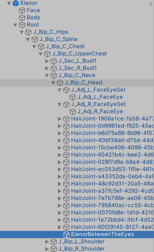 A common situation is to look at the face of another character. One approach for doing this is to put a GameObject inside the Face of the character for the other character to use it as a Look At target. That way the eyes will track the other character even as it moves around the scene. The following screen shot shows a GameObject added to J_Bip_C_Head called ElanorBetweenTheEyes.
