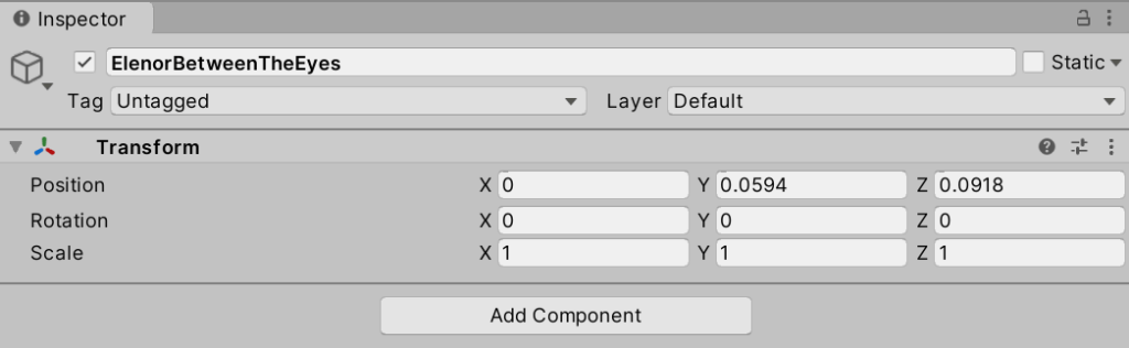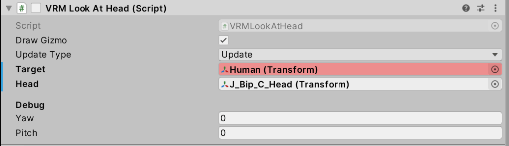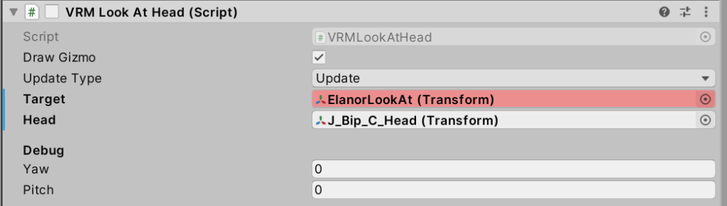 First, let is explore how to make the eyes to look at something. The UniVRM (the package which imports VRM files into Unity) adds a “VRM Look At Head” script to all characters when imported. This script finds the Head of the character and the eyes within the head, then works out which direction the eyes should be looking in order to look at the specified object. (Unfortunately this script only works when the scene enters “Play” mode, so when authoring the scene the eyes will not move.)