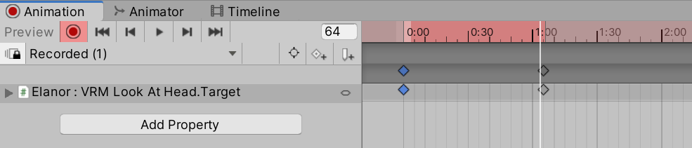 The end result will be an animation for the character “VRM Look At Head.Target” property with two keyframes for the initial and then modified look at target.