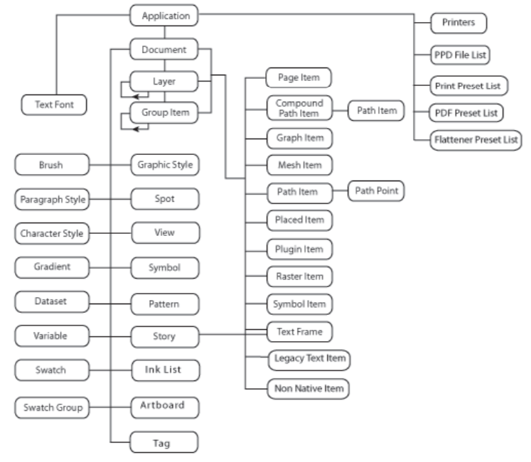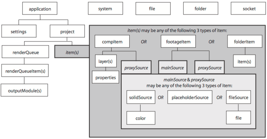 And for After Effects (https://ae-scripting.docsforadobe.dev/introduction/objectmodel/):