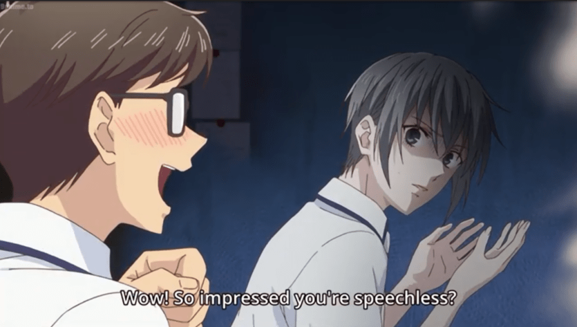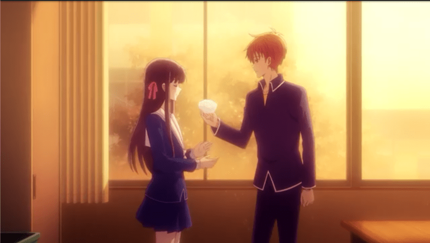 Kyo comforts Tohru gently, centrally framed.