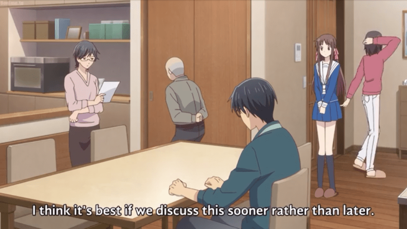 When Tohru is in her grandfather’s house, engaging with the others, there is no feeling of warmth. Colors are not used here, but notice how nobody is looking at each other or Tohru? Their very posture shares the message of awkwardness and discomfort.