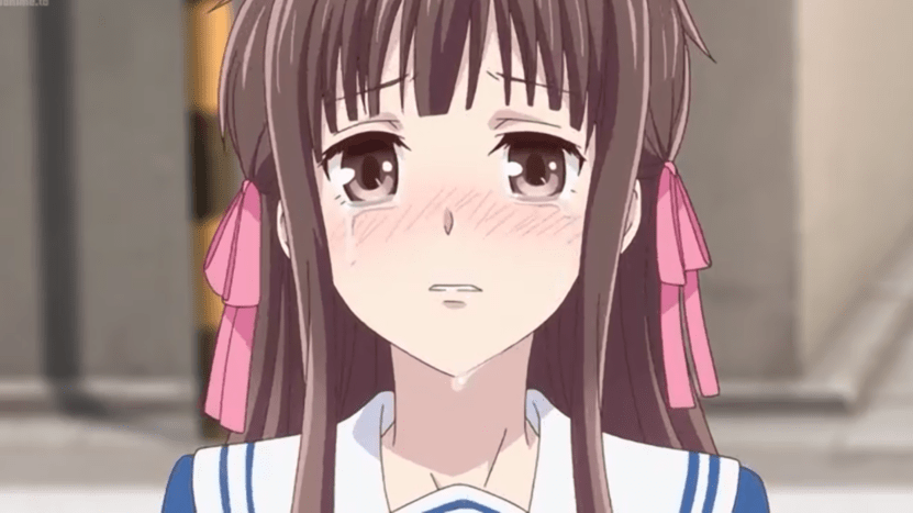 When Tohru leaves the house with Kyo and Yuki, it is interesting to see some shots outside. The first she is embarrassed. Center shot, concrete backgrounds. It is a goofy expression.