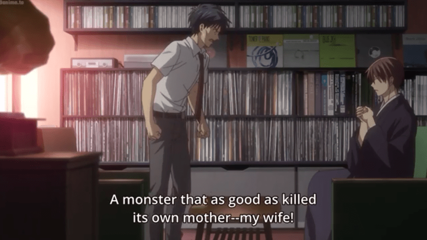 The contents of a background can have a message. Kyo’s father has been angry with Kyo ever since his wife died. Outdoor shots of the house look modern. Inside however Kyo’s father is always in the same room. It is not well lit. The wall is covered in vinyl records (on the left is the old record player). He never leaves the room, playing his old records – he is stuck in the past, unable to move on.