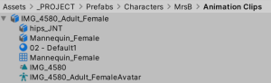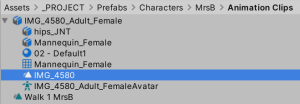 Finally I selected the animation clip inside the FBX file and typed Control-D to duplicate the clip. This makes a copy of it in a separate .anim file which I renamed to “Walk 1 MrsB”. I plan to delete the FBX file later.