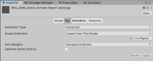 I clicked on the root FBX object, then in the inspector window picked the “Rig” tab, set the Animation Type to Humanoid, and clicked the “Apply” button. The converts it from using specific bone names to the Unity Avatar system of generic names, allowing it to be applied to a wider range of characters.