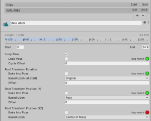 There are a lot of settings. Because this was a walk cycle, I set the “loop” checkbox, then adjusted the start and stop offsets in the clip (playing the clip in the panel at the bottom of the inspector window) until I found a good start and end position where the clip looped smoothly.