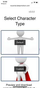 Initially I uploaded the trimmed video clips to Google Drive, downloaded to my laptop, then uploaded to deepmotion.com. (Later I found I could log onto deepmotion.com directly from my phone which saved a step, but the filename used was less friendly and sometimes you had to scroll down the page wondering why nothing was happening.) I logged in and selected “Animate 3D” from the available products (they also have body tracking, VR tracking, and physics engine products). On the next page I clicked “New Animation”. This asked me to select a character type, where I used the default.