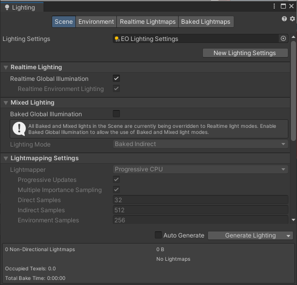 To change the lighting mode for a scene, bring up the Windows / Rendering / Lighting window. I created a “Lighting Settings” for my projects that all scenes share, to ensure consistency. The values it uses are: