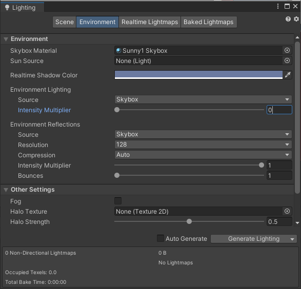 - Set the “Intensity Multiplier” to 0 for “Environmental Lighting”.
