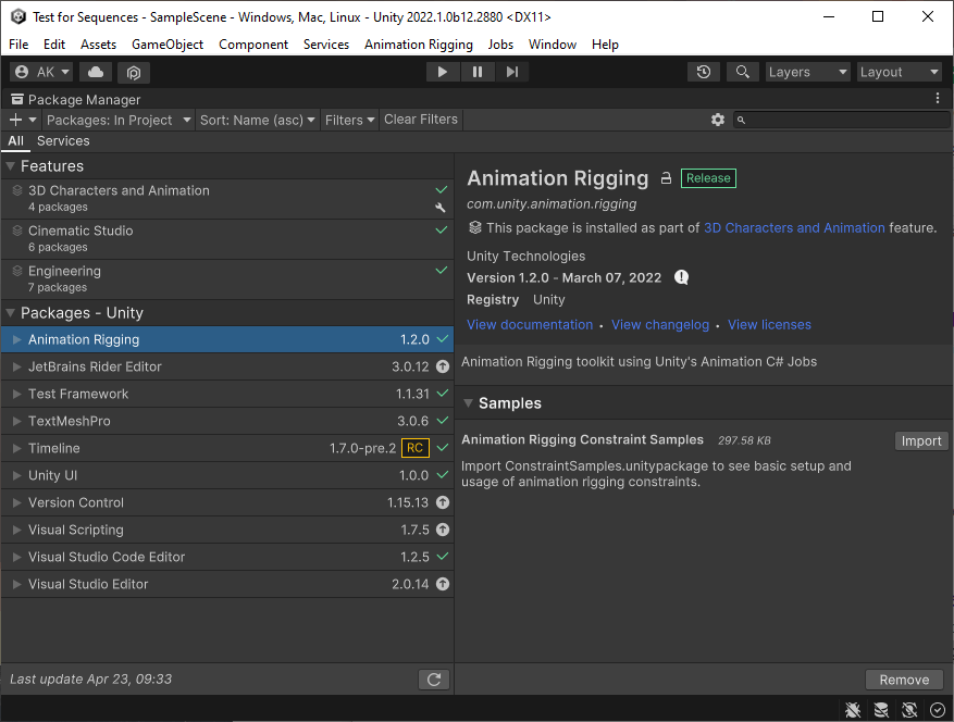 However, Animation Rigging 1.1.1 does not work with Sequences – there is a bug that was fixed in Animation Rigging 1.2.0. This is an official release (not a pre-release) but as of 2022.1b12 it still included 1.1.1 of Animation Rigging. If you pick a newer beta, see if it already has been upgraded to 1.2.0. If so, you can skip this next step.
