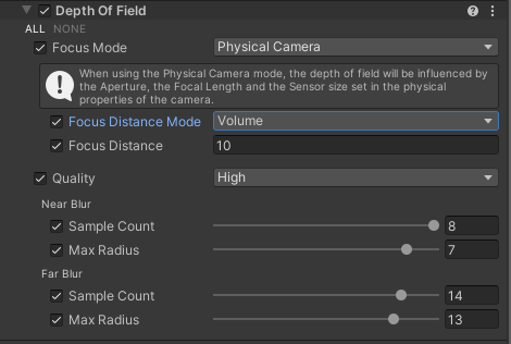 - Turn on the physical camera property of the main camera and pick the right physical camera settings based on the strength of blur you want (I plan to set up a prefab for this)