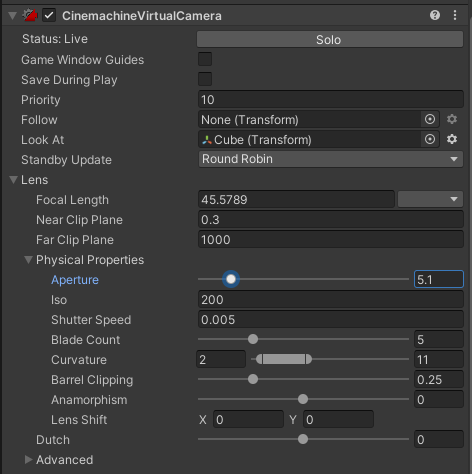 Think you can handle all the above! Great! Because we have not finished yet! How to change how much of the image will be in focus? This can be adjusted by setting the Cinemachine Virtual Camera “Lens” / “Physical Properties”/ “Aperture” property. Smaller values cause a more precise focus point, larger values will result in the whole scene being in focus. This was the width of the black area in the old visualizer. Now you have to work it out by looking at the screen.