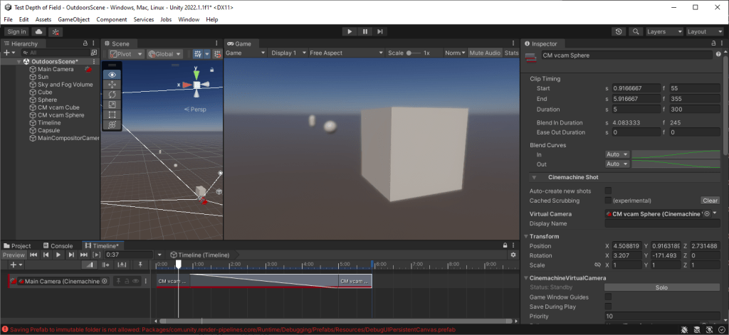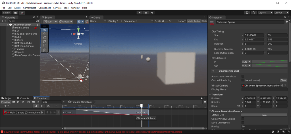 Further, you can blend between two Cinemachine virtual cameras and it will adjust the focal point from a foreground object to a remote one. Here is a simple sample project where focus changes from the foreground cube to the remote sphere. Note the timeline has a blend between two virtual cameras which have been set up with “Look At” target objects of the cube and the sphere.
