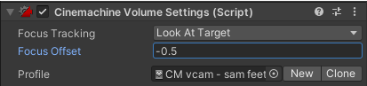 Then I set the Cinemachine virtual camera “Aim” to point at the first target object, and set the “Focus Tracking” mode of the “CinemachineVolumeSettings” virtual camera extension to “Custom Target” and point it at the second target object.