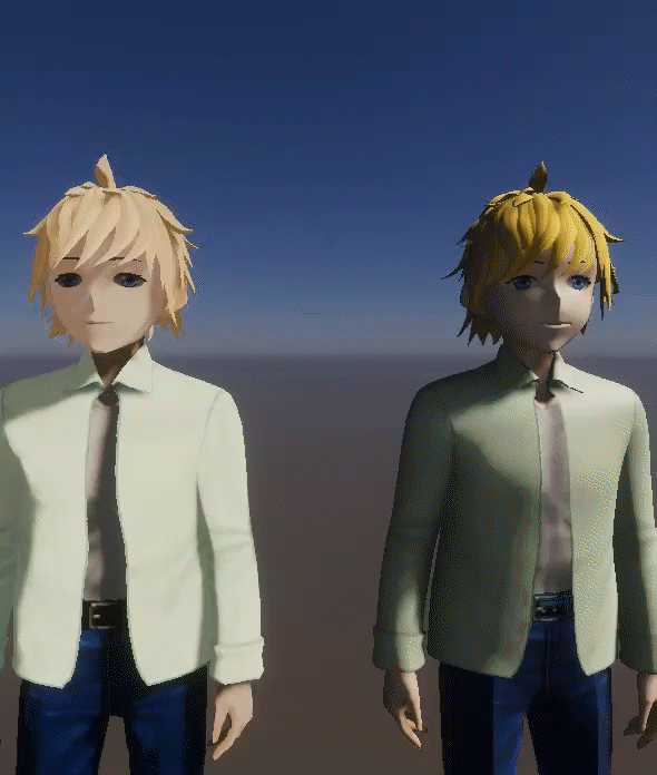 There is also a challenge with Cel shading and lighting effects. With Cel, it’s more like there are levels of light – if you are below the threshold its one color, above and it’s a different color. But that means you have less opportunities for special lighting effects (or at least its more complicated). For example, consider the following clip that has a point light moving between the two characters.