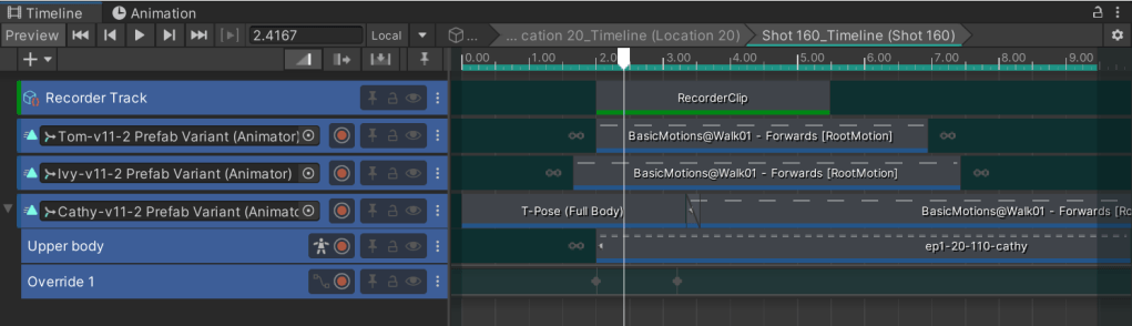 Please note: I am creating animation tracks directly under shot sequences and not using the Sequence support where a character stores the animation tracks as variants of the character (the default way Unity intends Sequences to be used). I find it easier to manage.