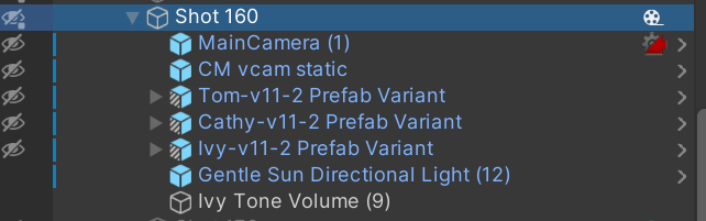 - Expand the sequences hierarchy of the first scene to show game objects, then copy all the objects from the top scene (the source) under the shot sequence in the bottom (destination) scene. I have all my character prefabs, volumes, etc here. (I click on the first child, shift-click on the last child, then CTRL-C to copy. By copying them all at once it preserves linkages between the objects. If you copy the objects one by one, the linkages between objects is lost.)