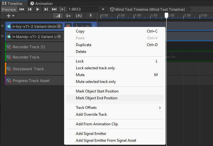 So right click on Ivy’s animation track and pick “Mark Object Start Position”.