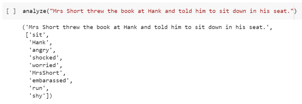 So it’s an interesting first step, but certainly not a production quality final solution. It leads me to think that understanding parts of speech may help. Can “Hank’s chair” recognize “Hank” as irrelevant (it’s a possessive adjective, not a subject). Can I associate emotions with specific characters?