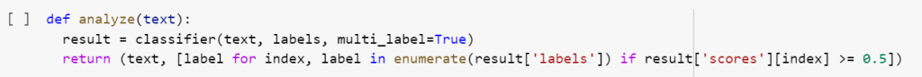 To make printing the results easier, I wrote a little function that prints all the labels that are returned with a score of 0.5 or higher. The classifier() function returns a dictionary with the original text and two new arrays — “labels” holding the selected labels and “scores” holding the score for each label. These two arrays are sorted by high to low score. The following python code tells it to loop through all the labels in order with “index” set to the array index and “label” set to the value, thanks to the enumerate() function, but only including values where the “scores” array for the same index is 0.5 or higher.