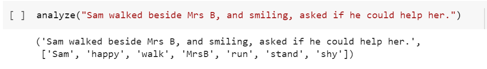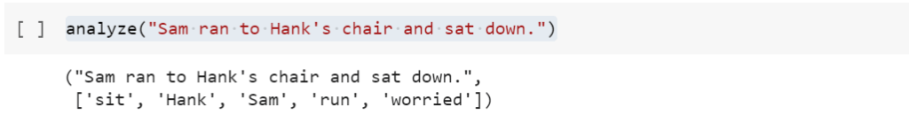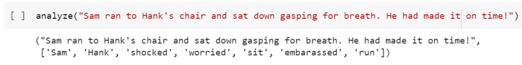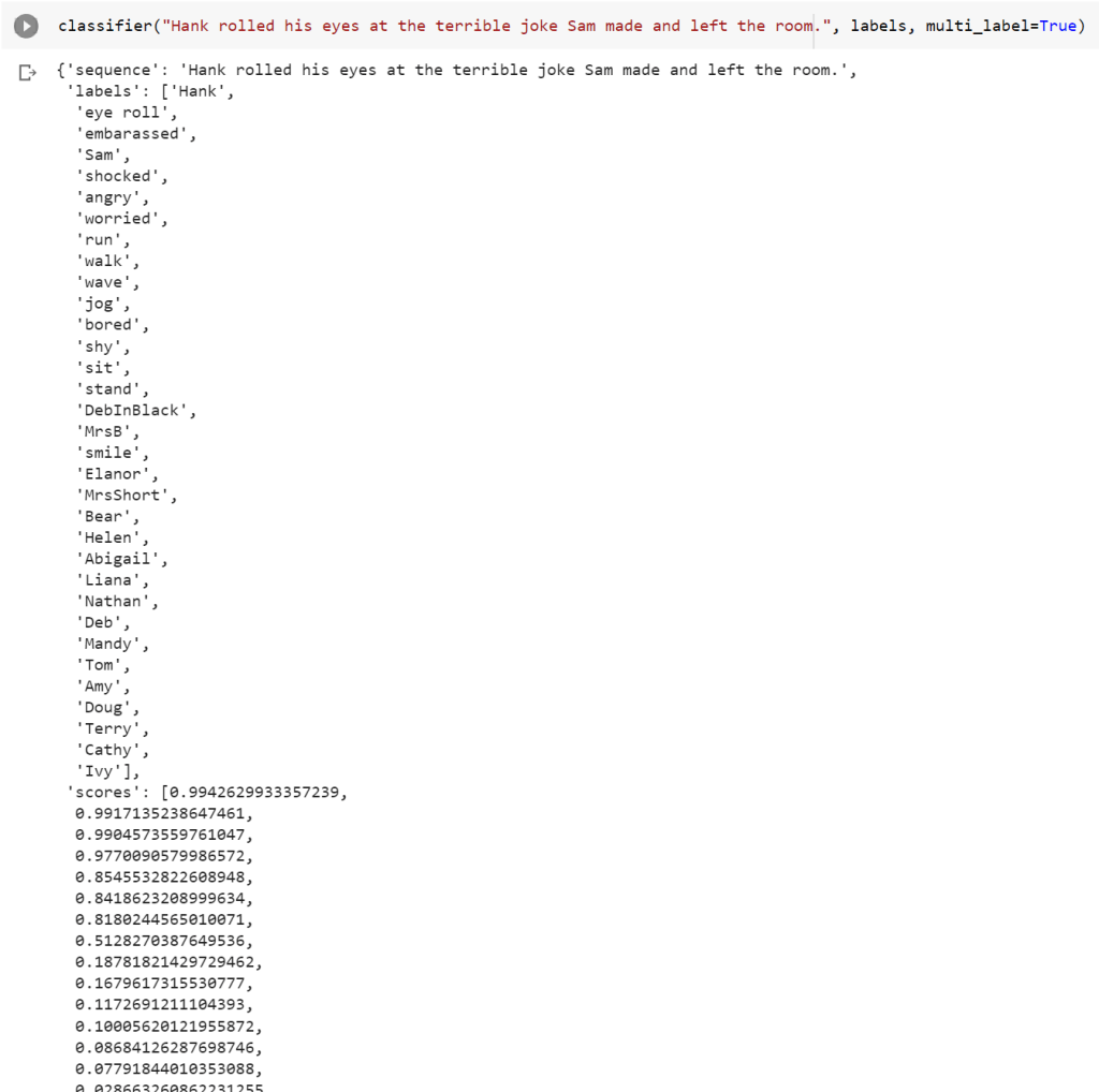 The result repeats the input sentence followed by the labels with score of 0.5 or more. So it successfully picked up “Sam” (direct mention), “sit” (from “sat down”), and “run” (from “ran”). With lower weights it also picked up “worried” and “shy”. These have lower weights, and might be predictions based on why Sam was running to the chair. But considering there was no training, not bad!
