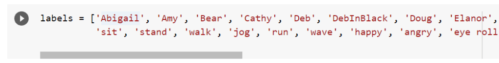 Next, I define a variable to define the list of topics I want to find. I include a list of character names, actions (walk, run, etc), and emotions which impact facial expressions. The question is whether classification can identify which characters, actions, and emotions are in the scene.