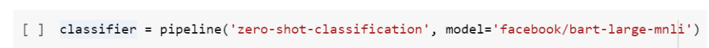 Then create a classifier. With “Zero-shot classification” you do not need to train the model. It uses the text of the labels (it can be multiple word phrases) to identify classifications with no training data. It does this because the model has learnt the relationship between words and phrases in the text. Note that the model referenced is 1.6Gb – so expect a big download to occur.