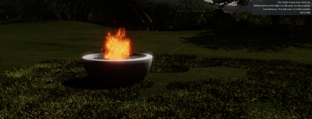 For example, in this shot, some grass is included near the firepit, but the distant trees, buildings, and mountains are a 360 image. If the camera moves too much up and down, the illusion is broken. But it is much less effort than modeling all of the background.