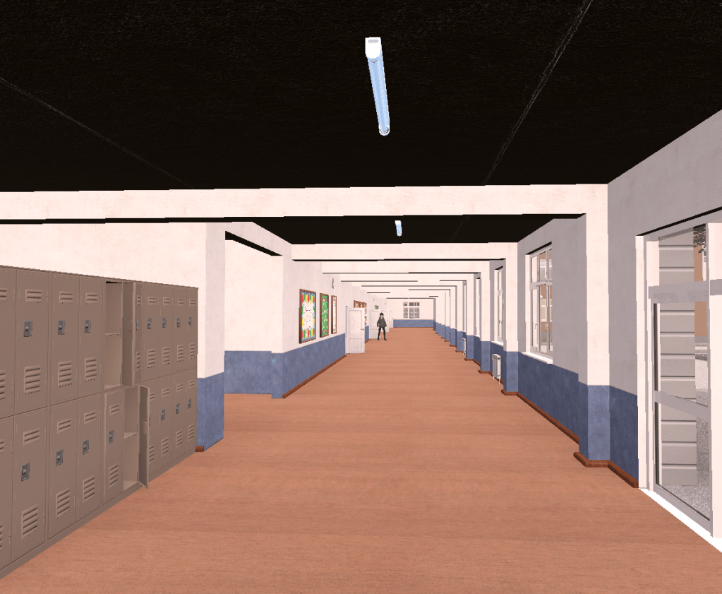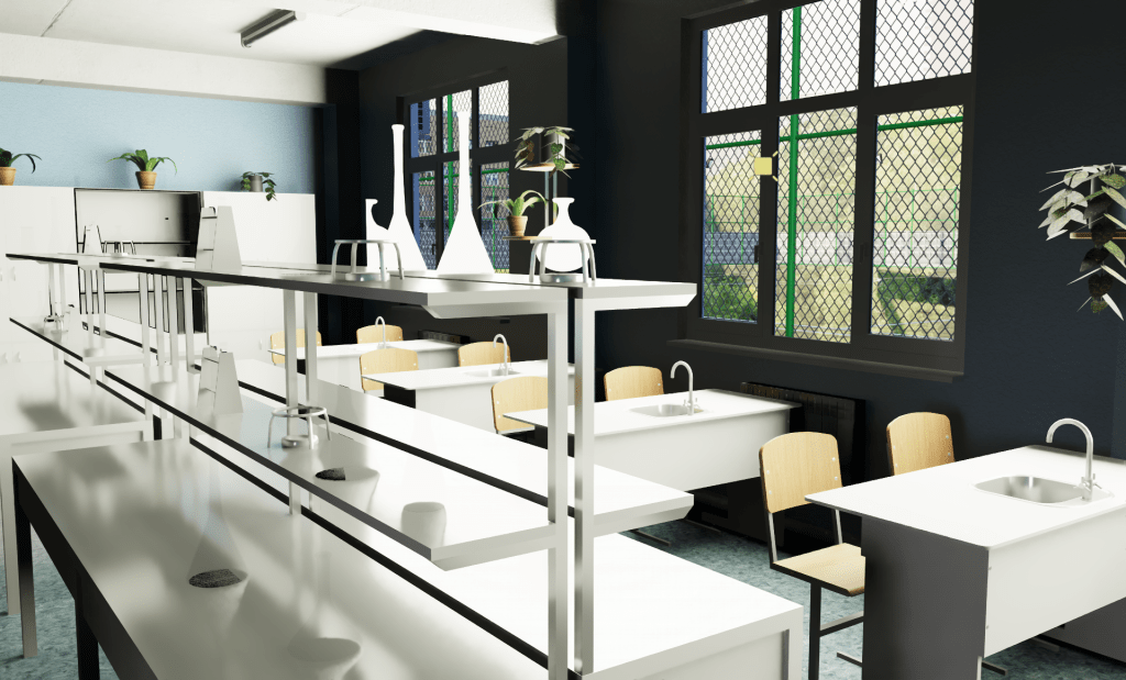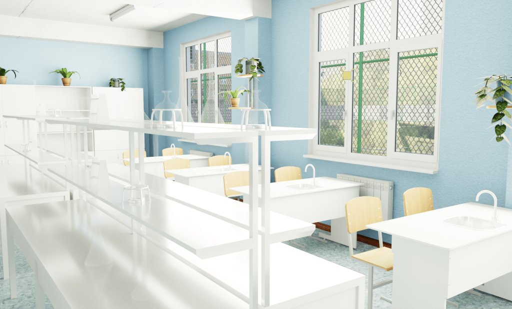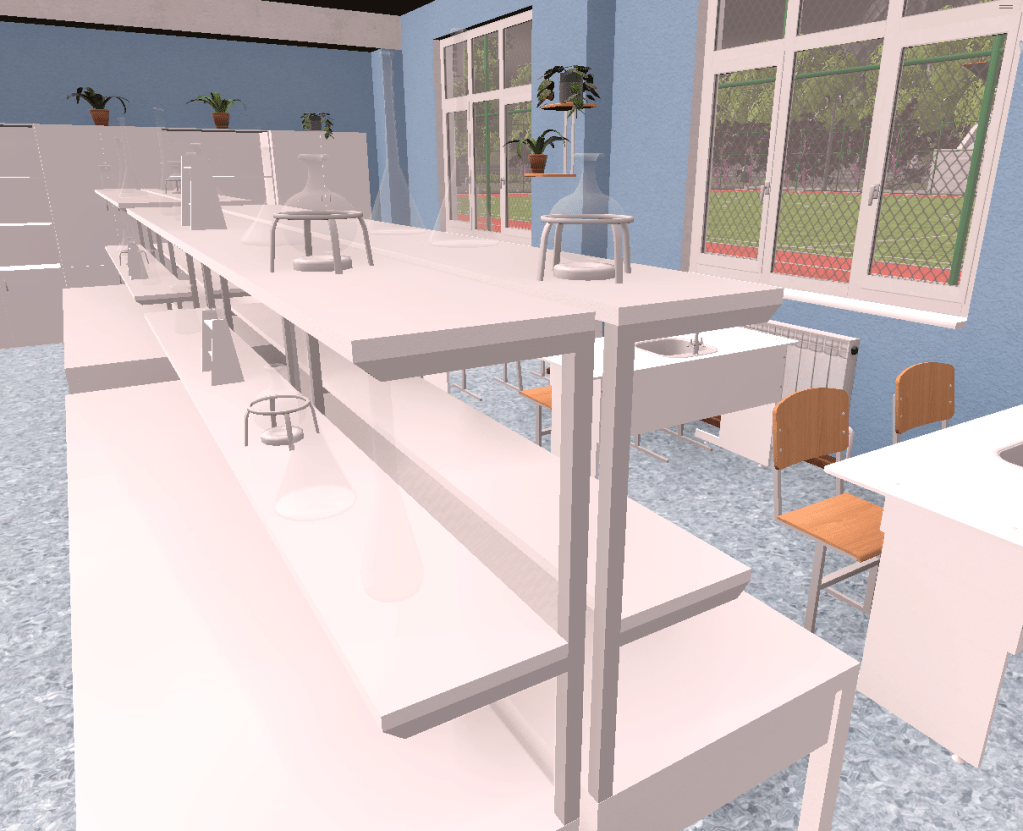 For final shot I used the science classroom as it had glass beakers and I was curious to see how they would come out. First, the default starting point. If you look carefully, you can see several glass containers on the bench top in the middle. Also note the strange shadows on the side of the front desk on the right.