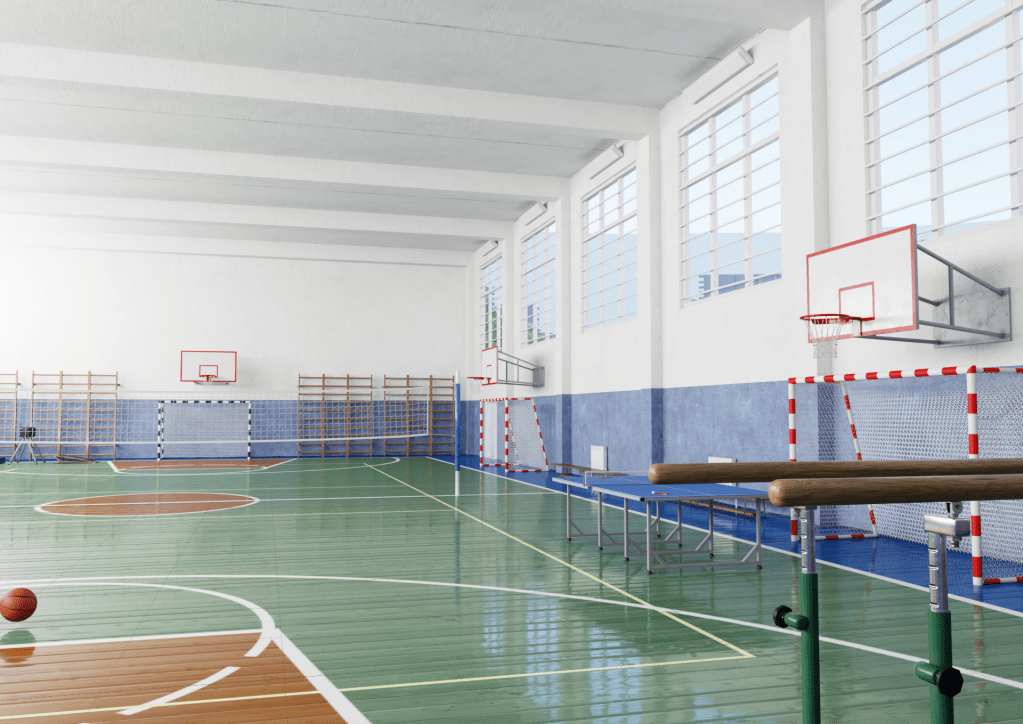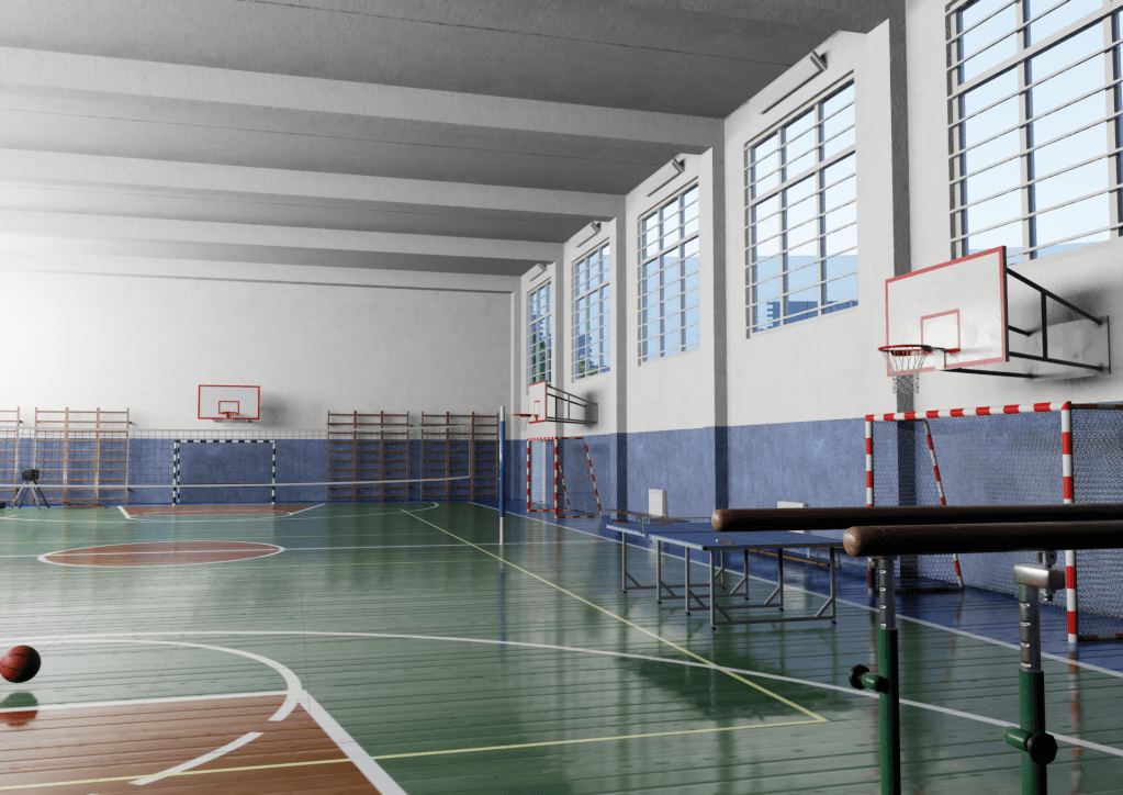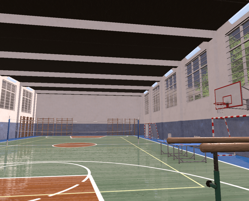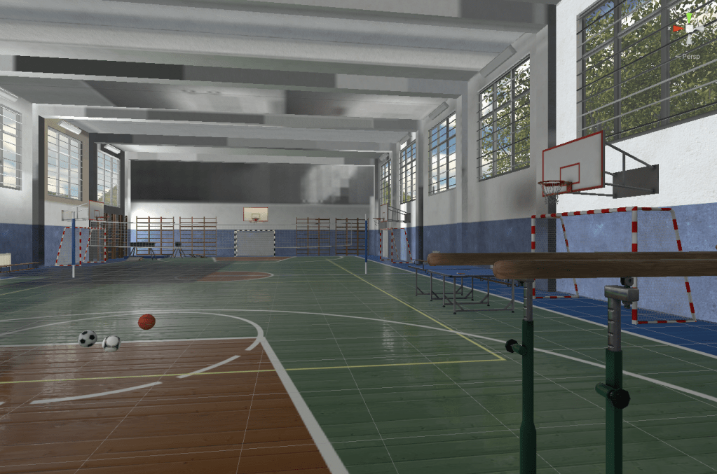 Next, a shot in the Gym with shiny floors. Again first, the Unity built in render pipeline. Note the shadows on the ceiling are not ideal.