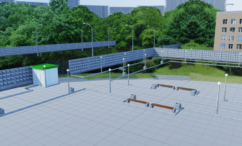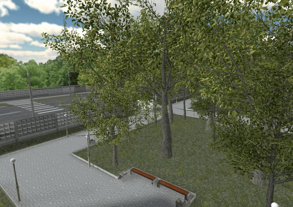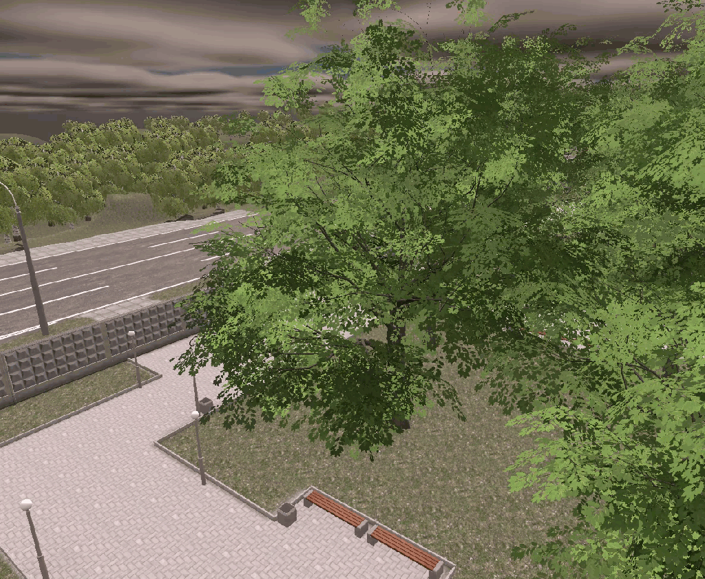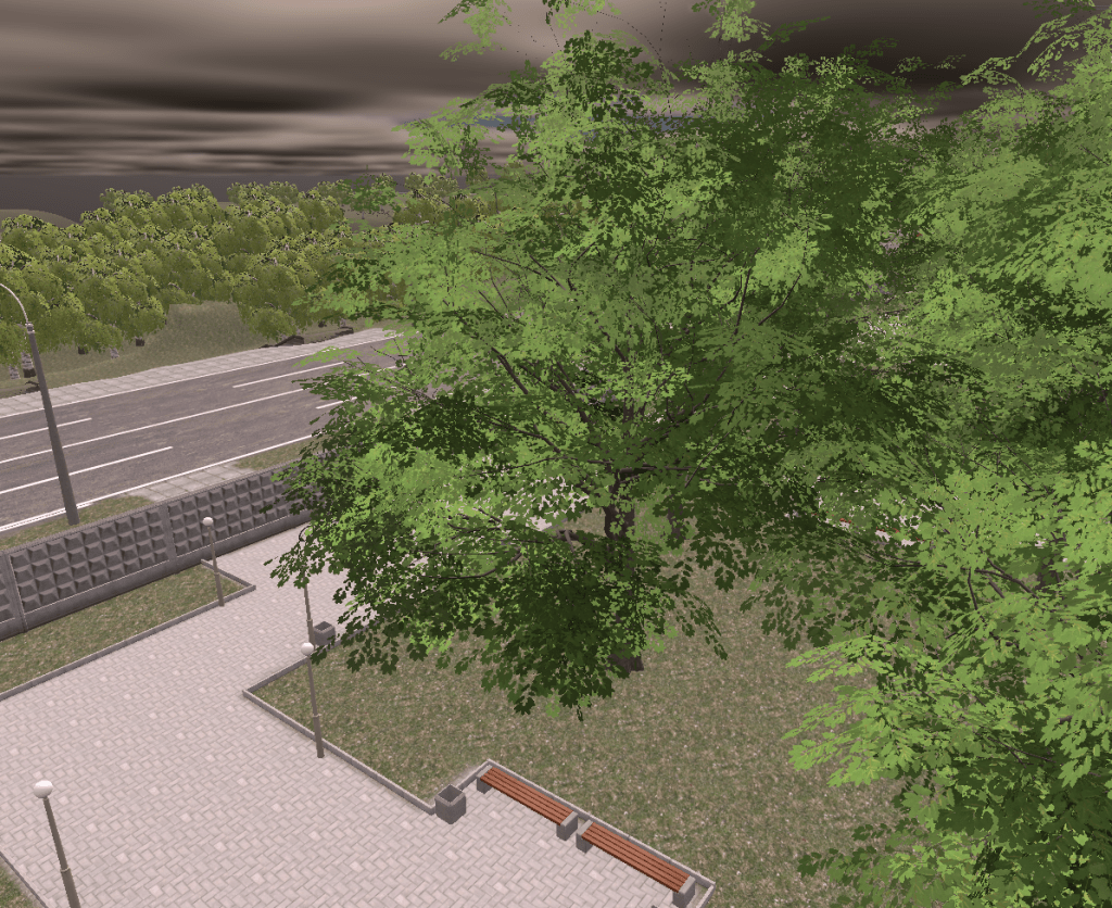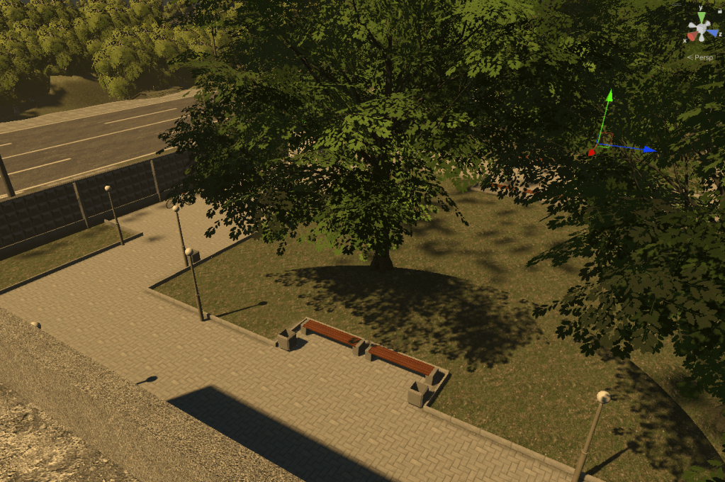 First, a shot using the built in render pipeline of some of the front yard of the school from the school roof. Trees in the foreground, a road out in the street, etc.