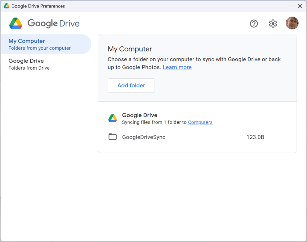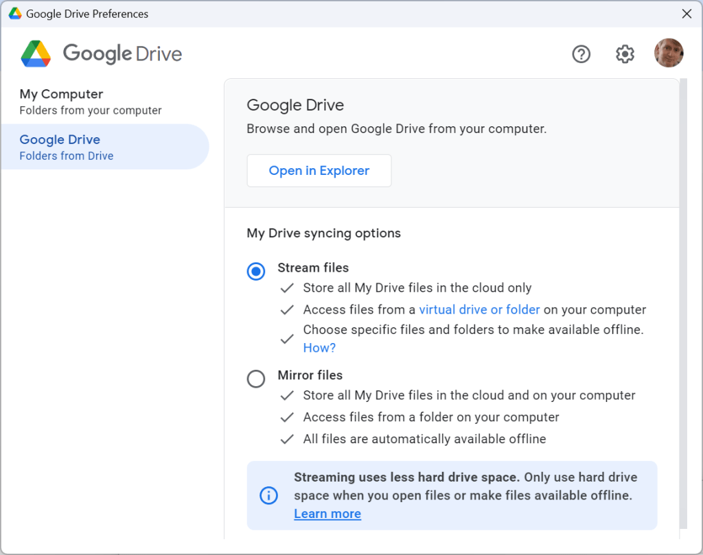 Streaming is what I want for “My Drive” – I don’t want all the files downloaded to my computer on my main area, consuming local disk space. Instead, I used the Google Drive app to add a new directory, D:\GoogleDriveSync, which is mirrored to the cloud (the only option for additional directories added this way).