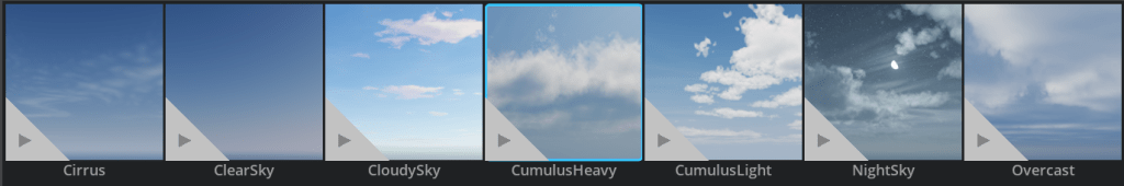 Unity (particularly HDRP) has a range of video effects. This includes volumetric clouds and fog which looks pretty good and interacts with the sun (clouds can obscure the sun). There is also a particle systems which can be useful for rain falling from the sky. Using shaders, you can create puddle splashing effects, and rain drops running down windows. Then there is water in swimming pools, lakes, oceans, and rivers (including waterfalls). Closer to fog, there is also smoke and fire.