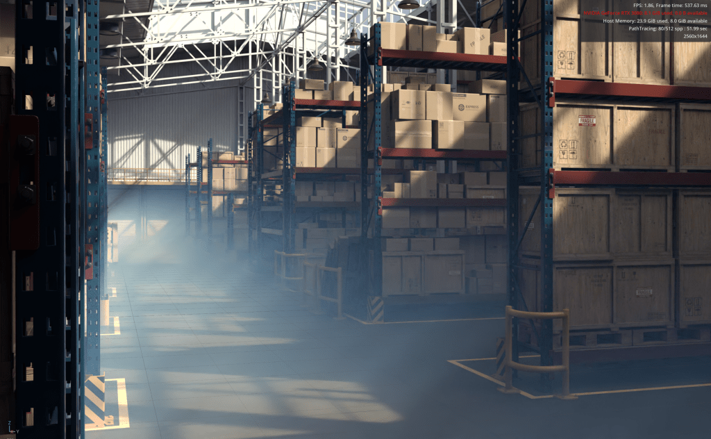 Using “Global Volumetric Fog” with Path Tracing (ray tracing does not work much) with a Anisotropy Factor (g) of 0.87 I managed to get the following image. This is better – the boxes near the top of the shot are clearer.