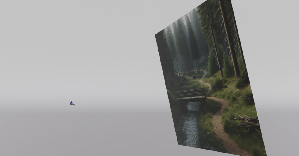You then use this information to take a plane with an image on it and “push” parts of the plane away if that part of the depth map image is darker. (The character in the scene is not part of the generated background.)