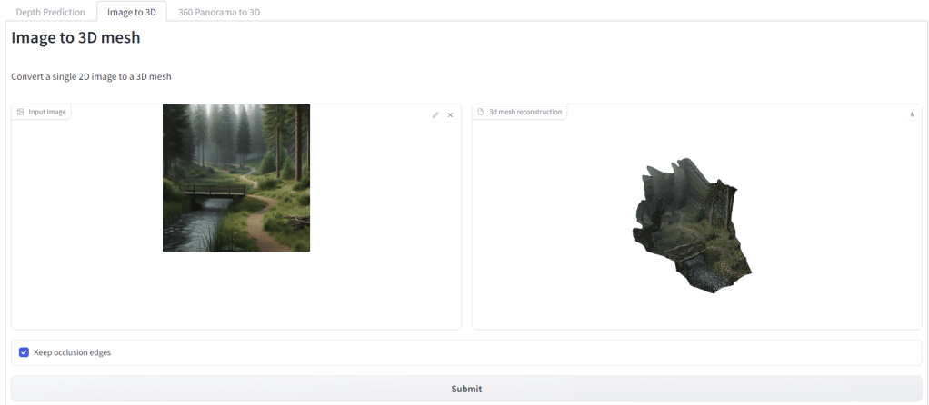ZoeDepth can has a mode to create a 3D GLB file where the image is projected for you. Pick the Image to 3D tab, upload your image, and it will show a GLB file on the right that you can then download.