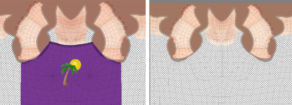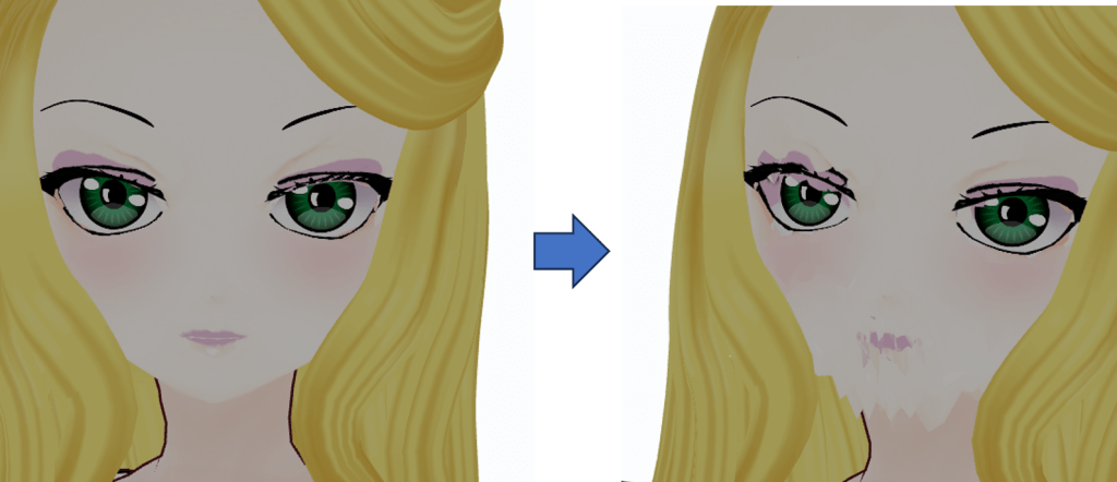 So how can we map the provided blend shapes to a new character with a different mesh? First, we look for what we have in common. In this case, it’s the textures (the PNG files). While the vertices of meshes has changed over time, the textures have not. So what we can do is work out a few vertices in the source blend shape close to the destination blend shape and average their values. This allows us to transfer blend shapes between meshes. To work out if a vertex in the source mesh is “close” to the destination mesh (for two characters with different facial proportions), map the 3D mesh vertex to the 2D position in the texture file and compare that. VRoid Studio works by changing the face by stretching mesh proportions. It does not change the texture file. That means we have a common set of reference points – (X, Y) coordinates in the texture file.