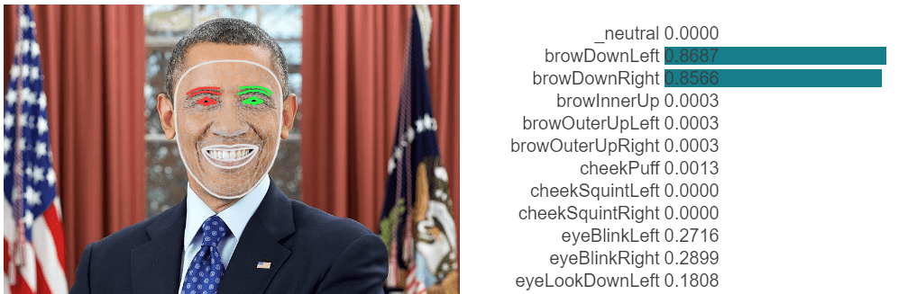 Google MediaPipe captures weights for 52 ARKit defined blend shapes. ARKit was created by Apple to capture different parts of the face. The following shows converting photo into a partial list of blend shapes weights.