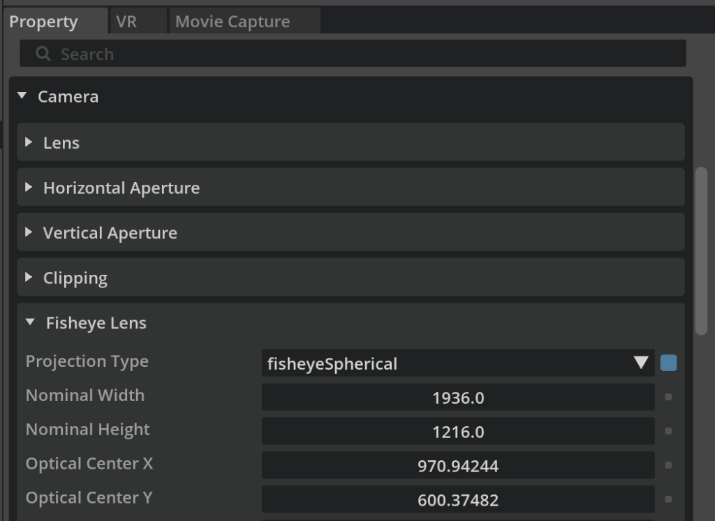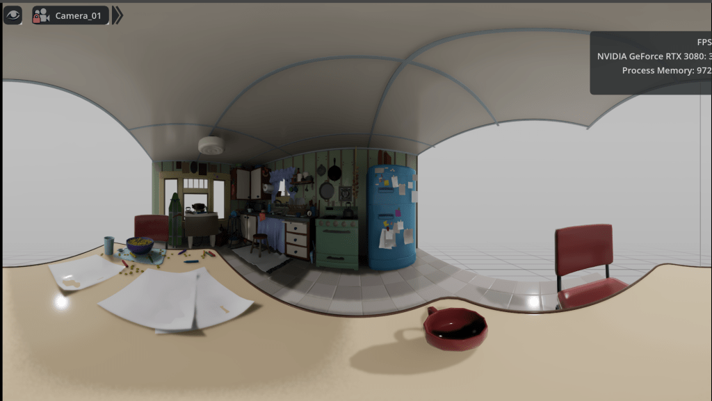 My first step was to capture a 360 image in Omniverse and view that in VR. That is, I want to turn my head around and look in different directions and see the image from that perspective. To do that, I created an Omniverse camera and set the “Fisheye Lens / Projection Type” to “fisheyeSpherical”.