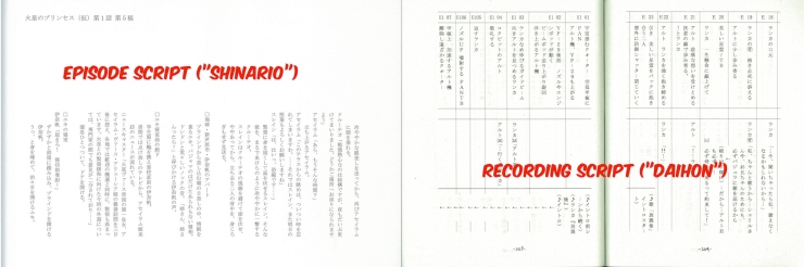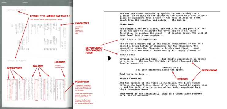 Examples from https://wavemotioncannon.com/2017/07/05/anime-pre-production-from-story-to-script/