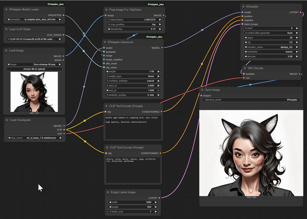 - KSampler, the heart of AI image generation. It takes the IPAdapter output along with the positive prompt, negative prompt, and empty latent image and generates an output latent image.
