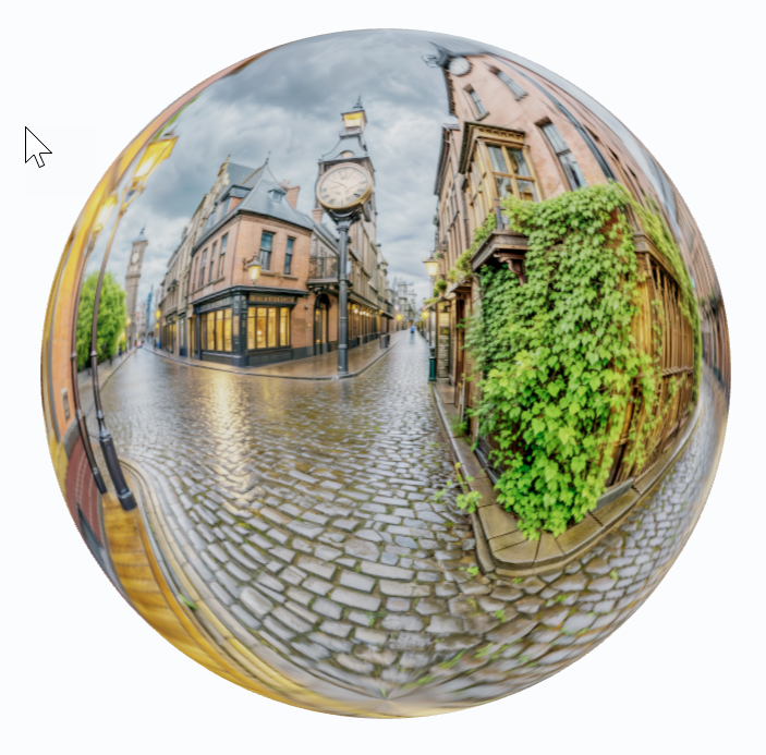 Here is an example of the above image projected onto a sphere with the camera pulled back outside of the sphere (normally the camera is in the middle of the sphere looking outwards). It gives a bit of a feel of how the image is projected onto a sphere.