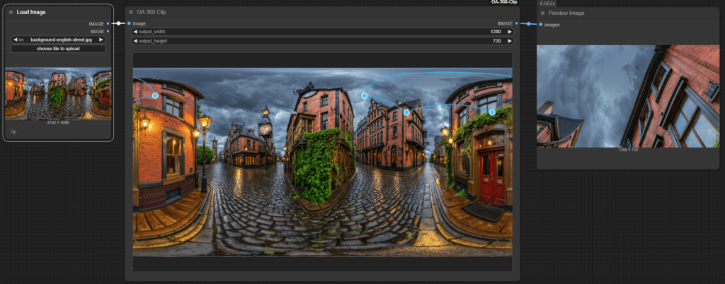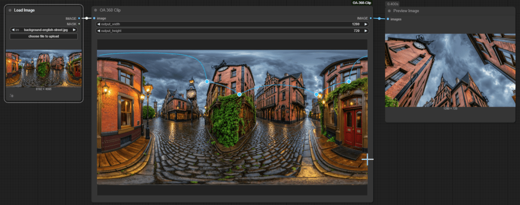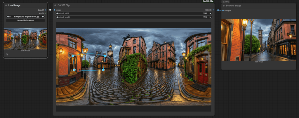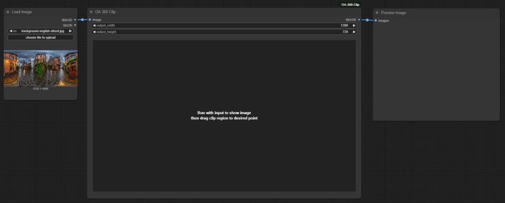 You then run the workflow once. This loads the image and makes it available for cropping in the OA 360 Clip node. It will have the default cropping region at the center of the image, but more often you start adjusting the position and size of the clipping region after the first run. The blue outline is capped to be at most 1/4 the total width of the 360 image as higher values look “strange” (distorted). Move around the outline and scale the size to get the background you want for a specific shot. Then use the background images, like the video above, to create a scene. Qwen Image Edit workflows are my favorite at the moment for merging multiple images together, such as a background and characters.